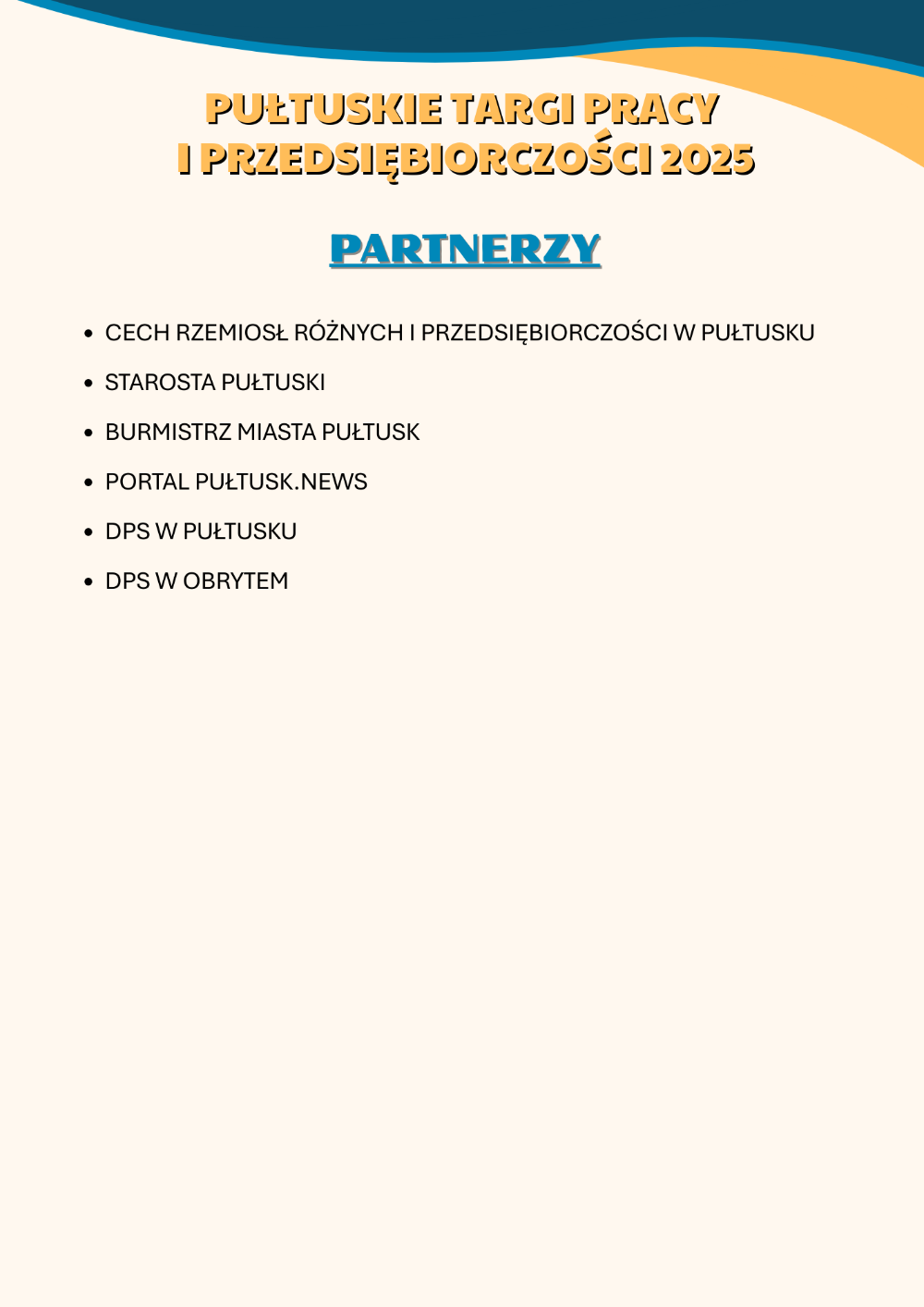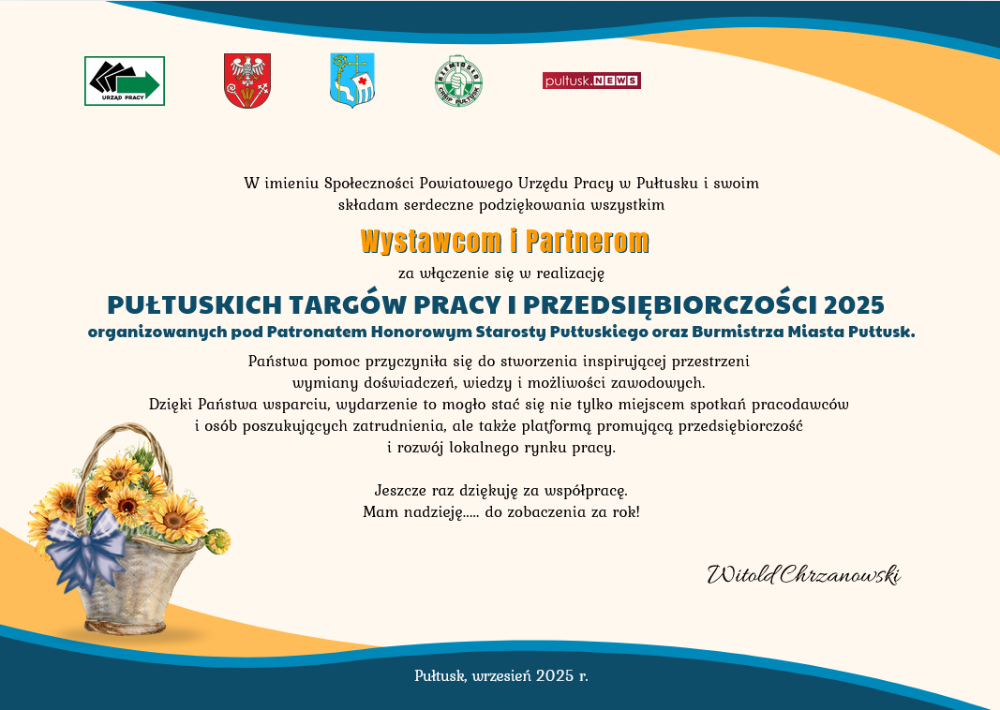 Pułtuskie Targi Pracy i Przedsiębiorczości 2025 - pełne spotkań, rozmów i inspiracji, nie mogłyby się odbyć bez Waszego wsparcia! Dziękujemy wszystkim Wystawcom i Partnerom, którzy włączyli się w ich realizację.